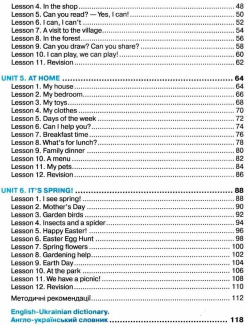 У підручнику шість тематичних розділів, матеріал у яких розподілений на уроки. Наприкінці кожного розділу подано узагальнення. Вправи створені з урахуванням вікових особливостей сприйняття першокласників, зокрема передбачено завдання для говоріння, аудіювання, читання, для роботи в парах і групах, а також творчі та ігрові.