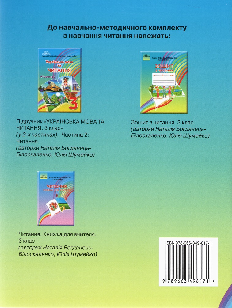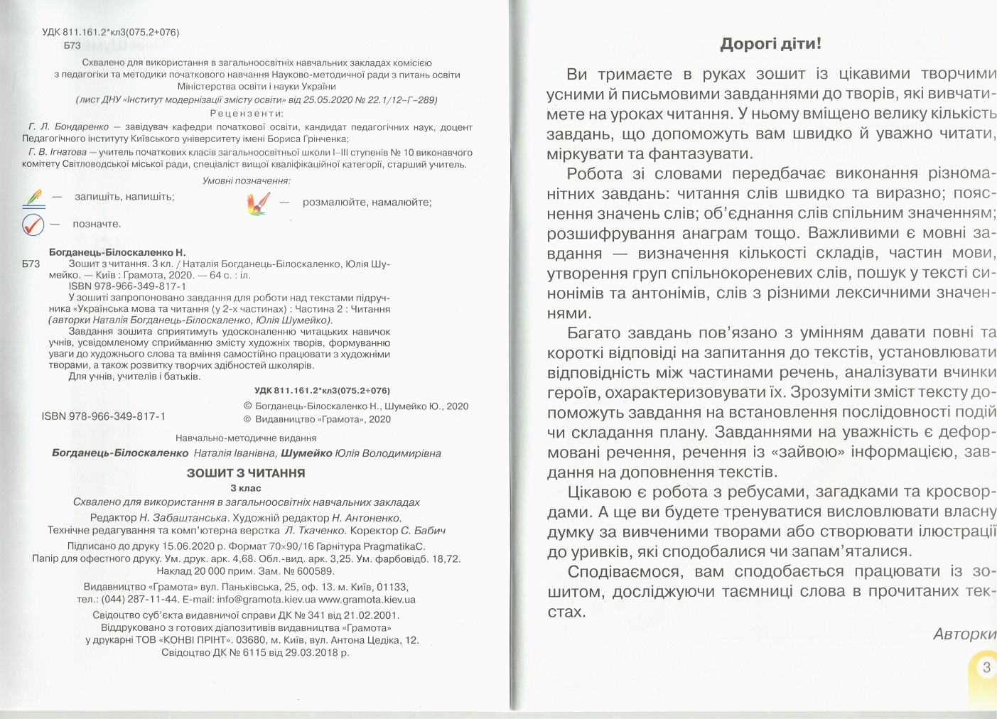 Зошит з читання 3 клас до підручника Наталії Богданець-Білоскаленко НУШ Грамота У зошиті запропоновано завдання для роботи над текстами підручника «Українська мова та читання (у 2-х частинах) Частина 2 : Читання (автори Наталія Богданець-Білоскаленко, Юлія Шумейко).