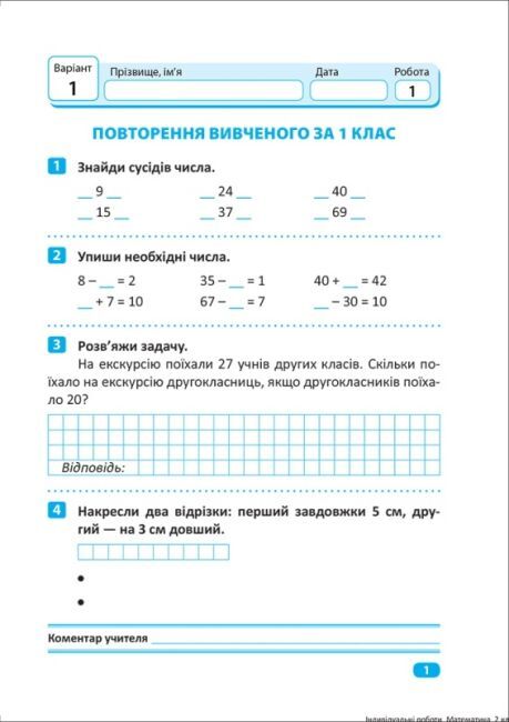 Посібник містить 16 індивідуальних робіт з математики у двох рівноцінних варіантах для спостереження вчителем за процесом сприйняття та розуміння учнями навчального матеріалу. А також для вчасного виявлення труднощів у засвоєнні певних тем і їх подальшого більш детального опрацювання. Видання впорядковано відповідно до типових освітніх програм початкової школи.