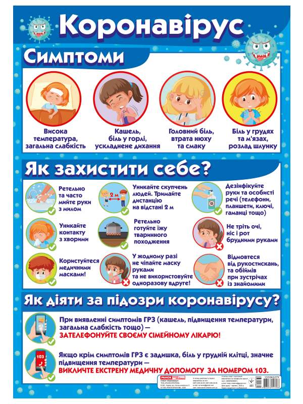 Нова українська школа Плакат Коронавірус НУШ Ранок. Створений, аби детально поінформувати дітей та батьків про запобіжні заходи від хвороби. Наочність містить розгорнуту доступну інформацію про захворювання та його симптоми.