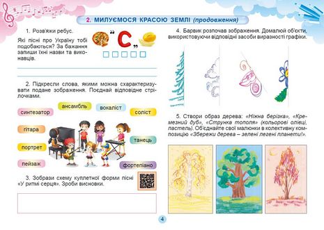 Є невіддільною складовою навчально-методичного комплекту до підручника. Завершує лінійку посібників НМК інтегрованого курсу «Мистецтво» у початковій школі. Посібник створює передумови для формування ключових і предметних компетентностей через систему практико орієнтованих завдань. Містить систему різних видів завдань музичної та образотворчої діяльності для виконання на уроці, удома та в позаурочний час. Завдання дібрано таким чином, щоб зорієнтувати від репродуктивного до творчого рівнів, від виконання простіших видів роботи до складніших. Гарно ілюстрований, містить педмалюнки етапів виконання робіт, пропонує вибір технік виконання.