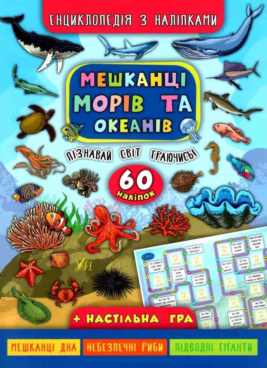 Енциклопедія з наліпками Мешканці морів та океанів. Це видання познайомить дитину із підводним світом мешканцями морського дна й коралового рифу, небезпечними рибами та морськими хижаками, підводними гігантами. У кінці книги малюк знайде захопливу настільну гру, що допоможе весело провести час із друзями, закріпити здобуті знання та пограти з яскравими наліпками, що містяться у виданні.