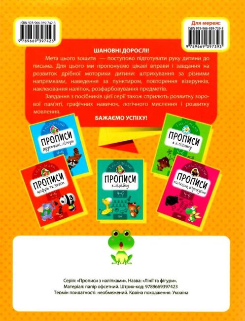 "Прописи з наліпками, 4-6 років: Лінії та фігури" - ідеальний вибір для батьків, які бажають підтримати розвиток навичок письма своєї дитини та зробити процес навчання цікавим та захоплюючим.